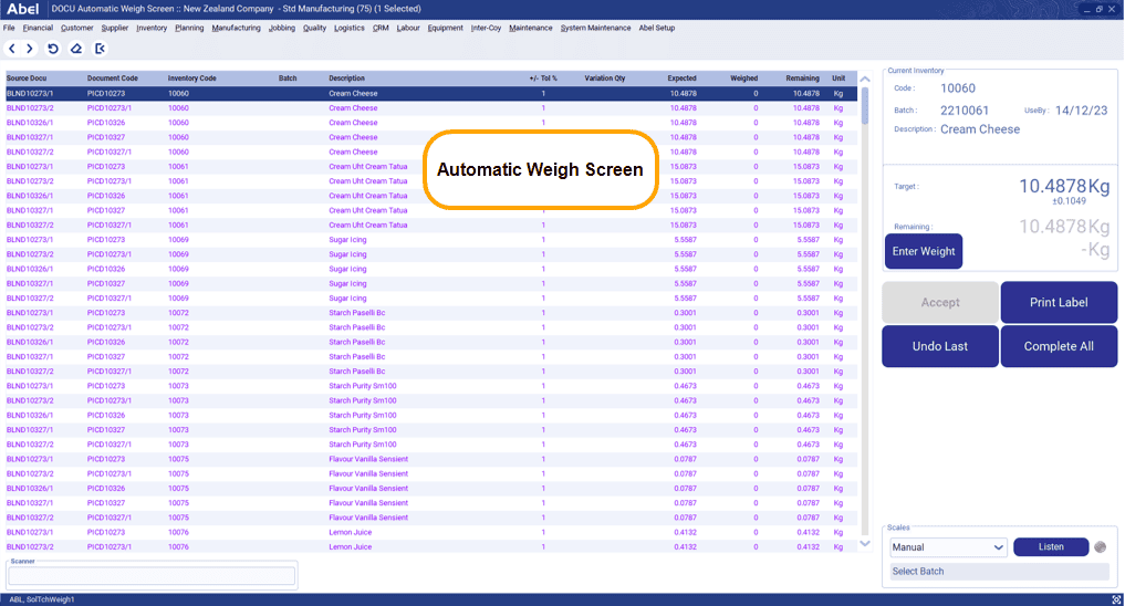 Abel simplifies the entire process by connecting directly to multiple scale sizes, enforcing item‑level tolerances, and guiding operators step‑by‑step through dispensing. Full and part bags can be split, reopened, and weighed multiple times with every action captured. Each weighed ingredient produces a label tied to its weight and lot, and those labels are scanned into blending and mixing machines to ensure the right recipe is followed in the right order. Batch sizes, full‑bag quantities, stock locations, and dispensing processes are all linked to inventory management, while user log‑ons ensure only authorised staff can weigh, consume, or adjust quantities – including controlled under or over‑consumption when required.