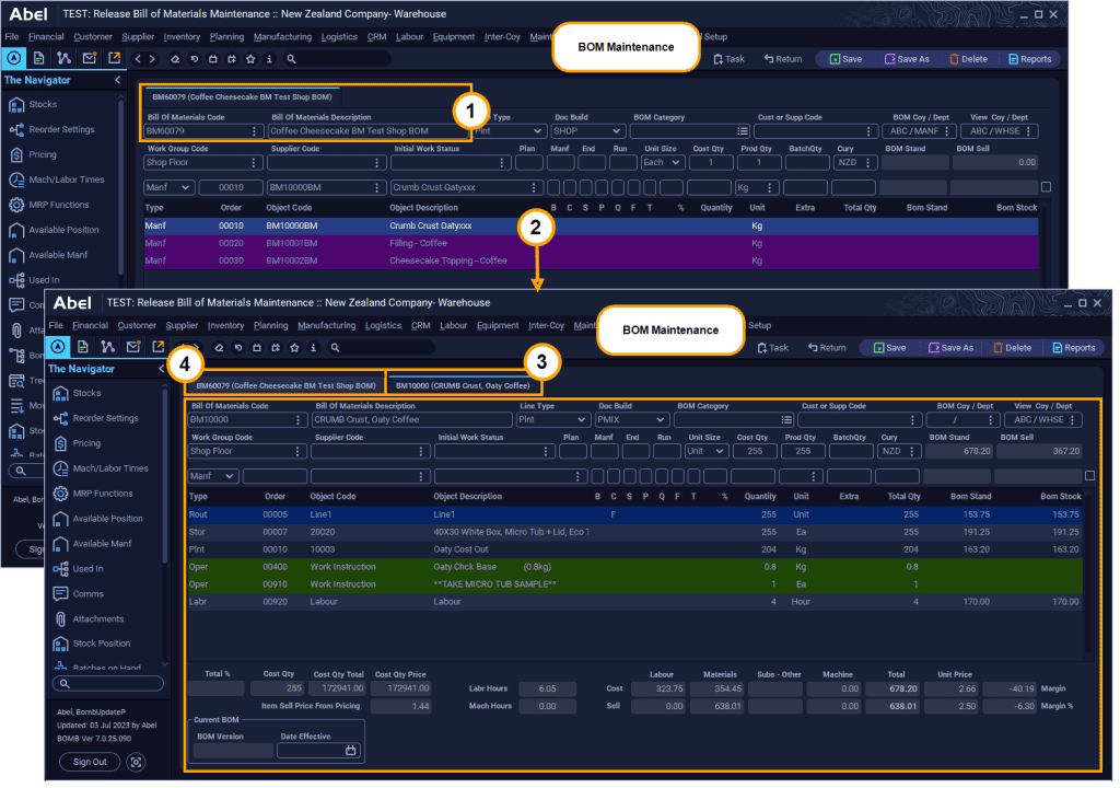 In this blog we’ll see how Abel provides visibility and drill-down through multi-level BOMs in the BOM Maintenance screen. Abel’s BOM Maintenance screen has a tabbed layout that enables you to view a BOM and its sub-BOMs, navigate between related BOMs and back to the top-level BOM. The tabbed layout helps customers with multi-level BOMs to view and maintain them more easily and view the cost breakdown at each level.