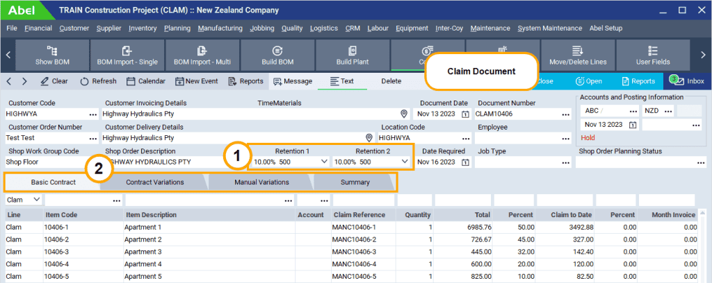 Abel ERP’s Payment Claims and Sub-Contractor Retentions enables these functions to be driven from within the ERP system. Claim documents are created from Customer Order lines or Customer Quote lines and their associated BOMs. Invoices generated from Claims provide retention behavior that complies with the Act.