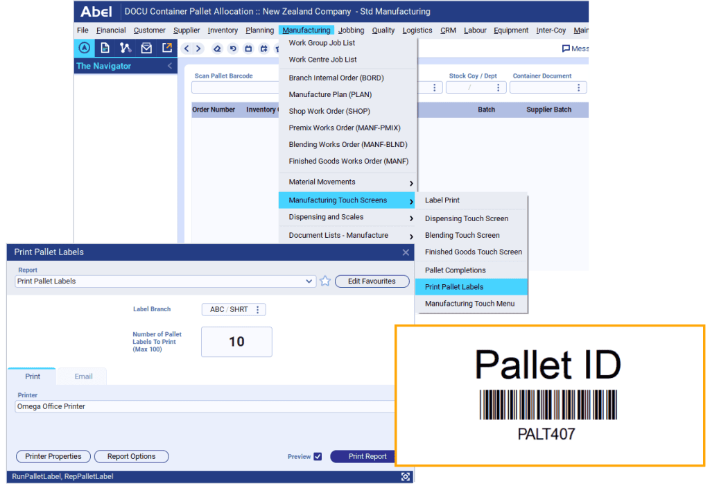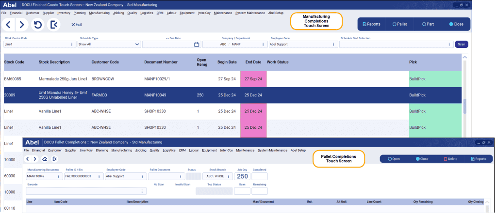 Abel’s Pallet Management functions are designed to simplify and automate pallet handling from packing through to container dispatch. Workers use handheld barcode scanners and Abel’s touch screens to pack goods directly onto pallets as they come off the line. The system captures barcode data in real time, prints pallet labels, and automatically creates pallet records in the database. Pallet Documents allow businesses to group items efficiently – whether it’s multiple pallets for one manufacturing order or combining items from different orders onto a single pallet. Workers can manage both pallet and non-pallet goods from the same workspace, and once packed, pallets are assigned to containers and dispatched using Abel’s integrated container management functions. The Pallet Enquiry feature also gives teams a live view of all active pallets and their status.