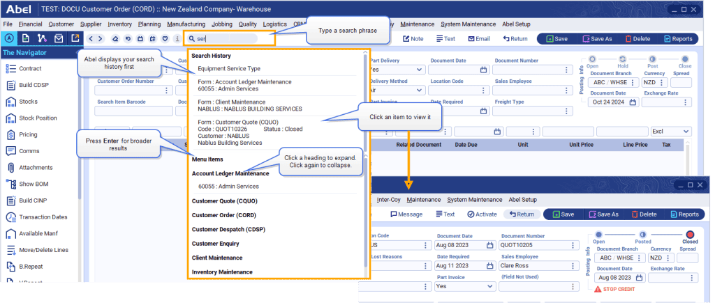 Available in Abel Version 7, Global Search lets you search across menus, documents, master data, and your own recent searches – all from one search box.