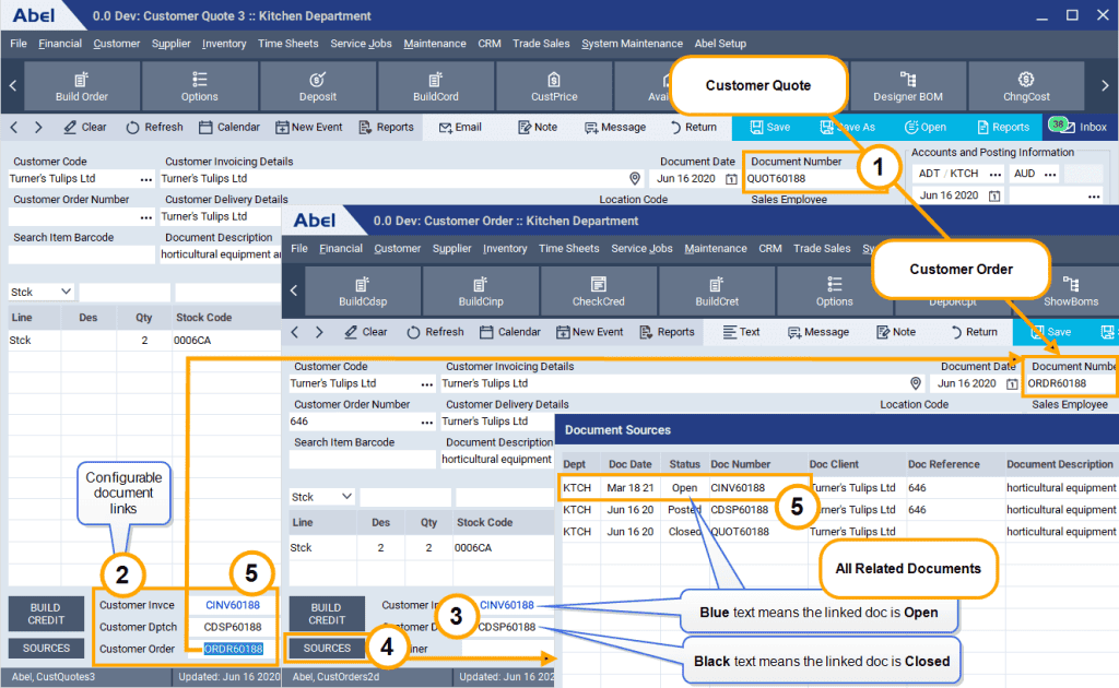 - When you sell goods to a Customer, Abel links related documents together e.g.